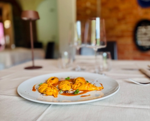€) et un menu mer (70 €) composés de 6 plats. Les plats changent tous les 40 à 50 jours. Parmi les entrées, vous trouverez des artichauts en tempura farcis de pommes de terre, de provola et de sauge avec une sauce aigre-douce, et du poulpe rôti sur un velouté épicé de lentilles et de crème aigre (18 €). À essayer : les agnolotti au chocolat farcis au cerf avec mousse au parmesan et poudre de chou noir (18 €) et les tagliolini aux 40 jaunes d’oeufs avec beurre à la truffe et truffe noire de Millesimo (20 €). En plat principal, la joue de Fassona au Nebbiolo (22 €) et les crevettes roses de la mer Ligure sur crème de patate douce et zeste de citron confit (24 €). Desserts créatifs comme la Cornucopia, cannolo sicilien à la confiture d’oranges rouges, ou la Sacher avec namelaka au caramel et abricot déshydraté (10 €). Service attentionné, avec Tommy et Sabrina qui vous guident également dans le choix des vins, issus d’une cave riche en étiquettes ligures et piémontaises.