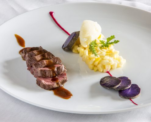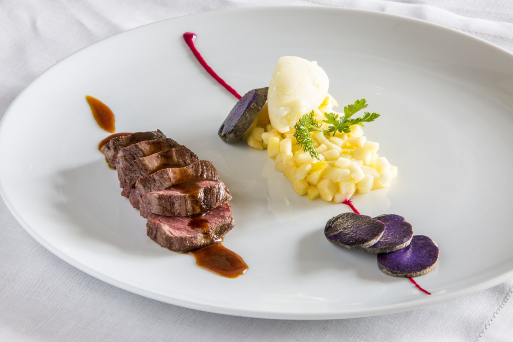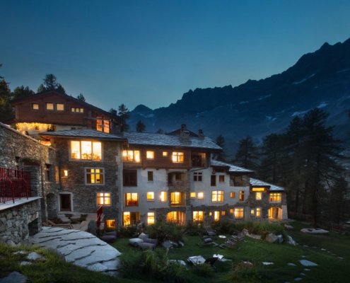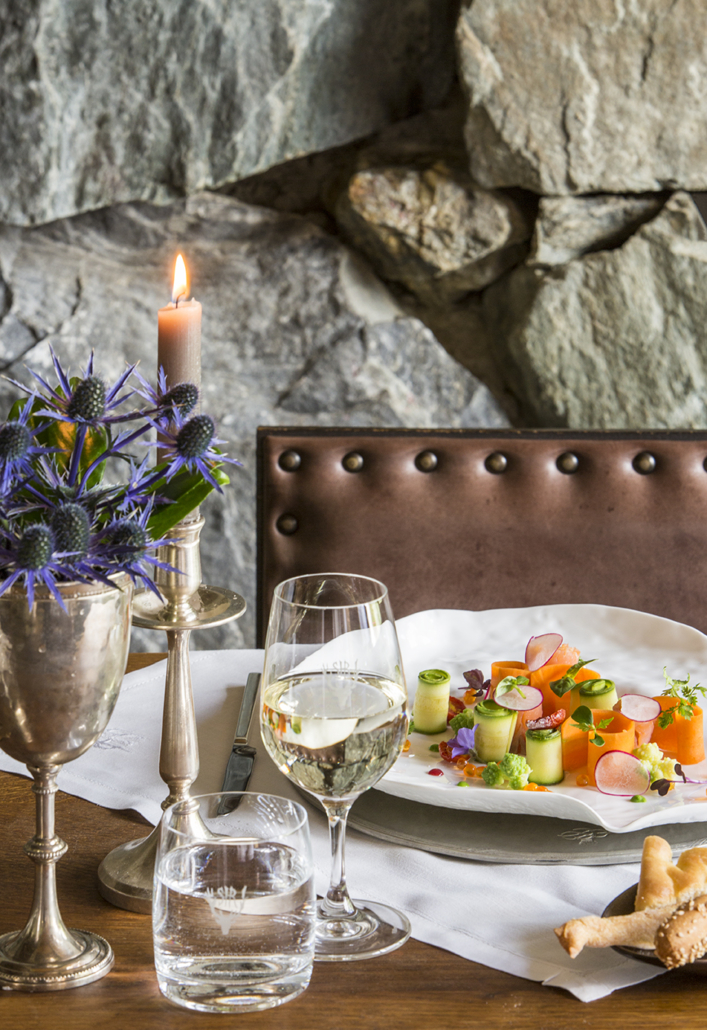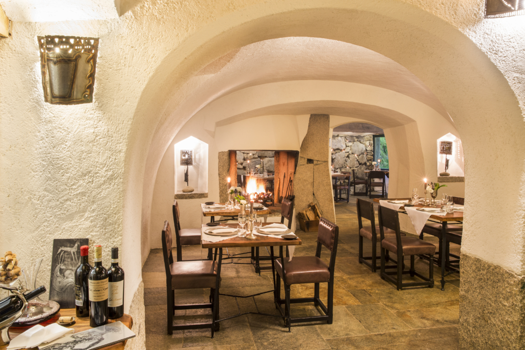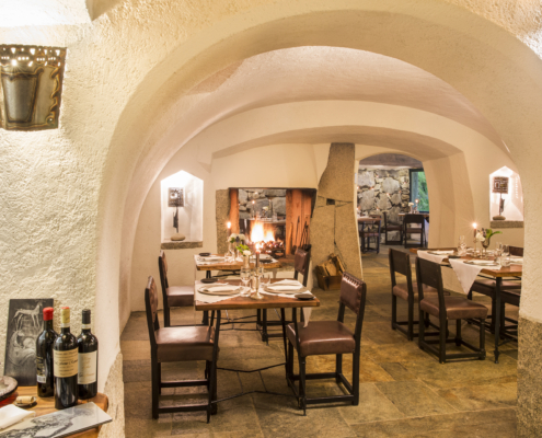 La cuisine du chef Andrea Rizzo met en valeur ’excellence italienne et valdôtaine avec des plats traditionnels réinterprétés avec légèreté et technique. Le restaurant dispose d’imposantes voûtes, de murs en pierre et d’une grande cheminée, où le maître d’hôtel vous guide avec compétence dans le choix d’un menu de saison qui allie d’excellentes matières premières et la créativité. On commence par l’amuse-bouche : huile de Viterbe à froid, gressins au safran, beurre d’alpage, giardiniera piémontaise et couscous. Parmi les entrées, de 22 à 26 €, on retiendra le carpaccio de pezzata rossa valdôtaine avec chips de polenta et mayonnaise aux herbes ou le saumon mariné à la betterave rouge. Parmi les entrées, entre 24 et 28 €, très appréciées des clients étrangers, les tortelli d’ossobuco avec fondue de parmesan 36 mois et safran, ou les pâtes fraîches faites à la main. Dans les plats principaux, entre 24 et 36 €, large choix entre terre et mer : du thon tataki